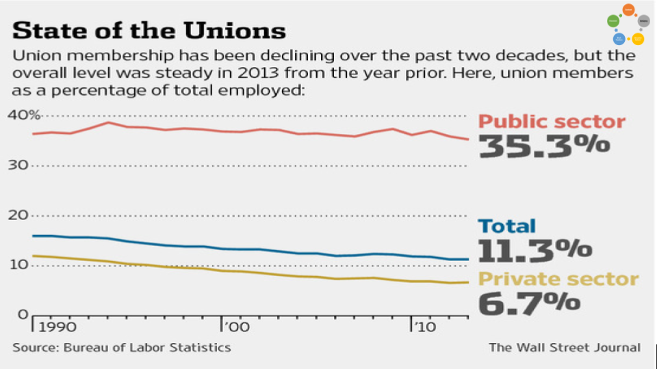 And here you see the rate of union affiliation among the public sector is roughly 25% points higher and has remained pretty constant through the years. And not coincidentally, what unions are most often under attack in the media and by politicians?