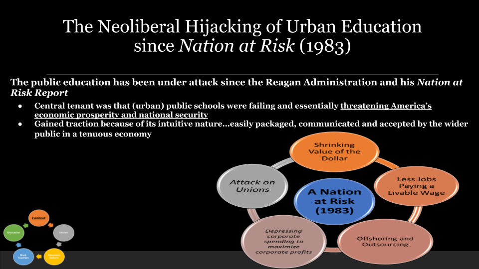 Timing is everything…A Nation at Risk took place at a time where the country was in an extreme economic downturn and is directly connected to the tenuous economic situation most Americans were experiencing. As such, this report was one of the first times we see public schooling explicitly linked to our nation’s economic condition. Before then, we’d been told public education was to yield critical thinkers, to prepare people to participate in a democratic society, and for personal growth and development, but here, the message was public education should serve the nation’s corporate interests and meet the desires of capitalism. This represented an enormous paradigm shift in both purpose and mission of public education.