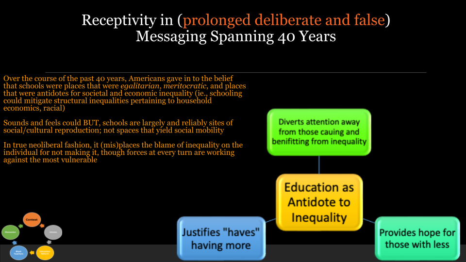 It seems to make sense. If a student gets good grades and a good education - whatever that really means, they would get a good job with good pay; if they get crappy grades and a crappy education, then they should expect a crappy job with crappy pay and it is the student - the sole individual - who supposedly controls that future. Here, the individual alone, regardless of circumstance, is responsible for their own fate - and the public should not feel a sense of responsibility to others. What’s missing in all this is that schools have long been identified as spaces that reinforce social, and cultural inequality under the mirage of meritocracy…all WHILE the economy surrounding and influencing schooling, is progressively becoming more hostile to workers and potential workers. But in schools however, politicians and the affluent can keep blaming schools for the growing disparities within our society that they themselves orchestrated. It’s an effective conceptual misdirection. Schools are, and have long been, blamed for the result of decades of neoliberal policies and corporate greed that’s been crushing people. Contemporary schooling does not, and can not, make up for the realities of living in a capitalist economy.