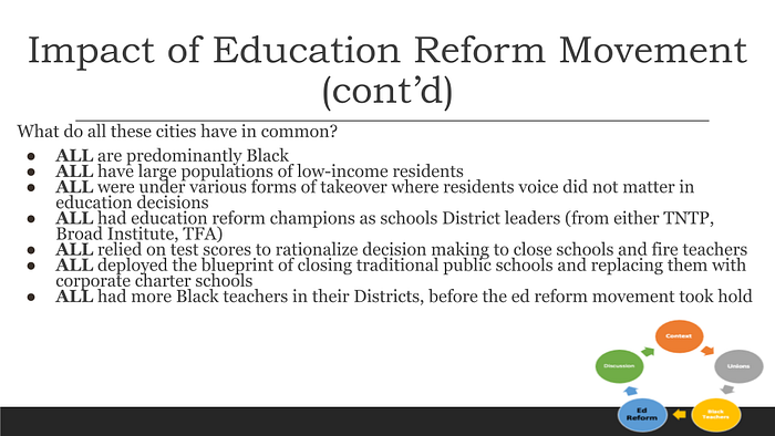 Where do the highest concentrations of Black teachers work? In the very Districts that were deliberately and preemptively targeted by reformers and lawmakers to access those large urban district budgets, and because those areas have little in the way of democratic representation. What this looks like in practice: A teacher who grew up in North or West Philly, graduates from college and decides she wants to educate children where she grew up, and thus, is working at a neighborhood school attended by predominantly Black or Latino kids, but in a neighborhood that is high in economic poverty (not cultural or moral poverty) and everything that goes along with it. That teacher, because of where she decided to dedicate her energy, abilities, and care, was targeted to lose her job. And, that child’s school was targeted for takeover under the education reform movement.