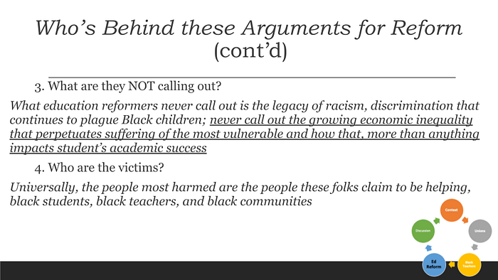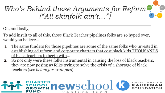 The Black messengers of education reform behave similarly. Here, the answer for only the Blackest and poorest areas to succeed economically, is through getting a “good education”; which they reduce to mean receiving “good test scores”. And when, predictably, the most impoverished and exploited students and schools in America did not produce “good test scores”, the same folks who profit from inequality and pushed for this education misdirection, are already well positioned to profit from their dispossession (in teaching, district and school operations, budgets, and even neighborhoods). Behind all of this, I hope folks can recognize from the beginning of the education reform movement to today, the effort was, and always has been to for the wealthy to access a massive pool of public money that was once off limits. And in order to do so, they had come up with a problem that, presumably, could only be solved by giving wealthy corporate interests more public dollars, and greater control over those public dollars. And, in that large urban districts filled with Black and Latino students and Black teachers have the largest budgets, politicians along with wealthy corporations, targeted urban school districts in order to access enormous sums of money. Though the decades-long shifting of money from the domain of the public to private had nothing to do with improving the lives of Black and Latino kids, Black and Latinos kids, their communities, and Black teachers are collateral damage in this racist neoliberal endeavor.