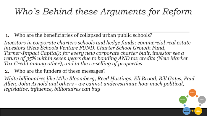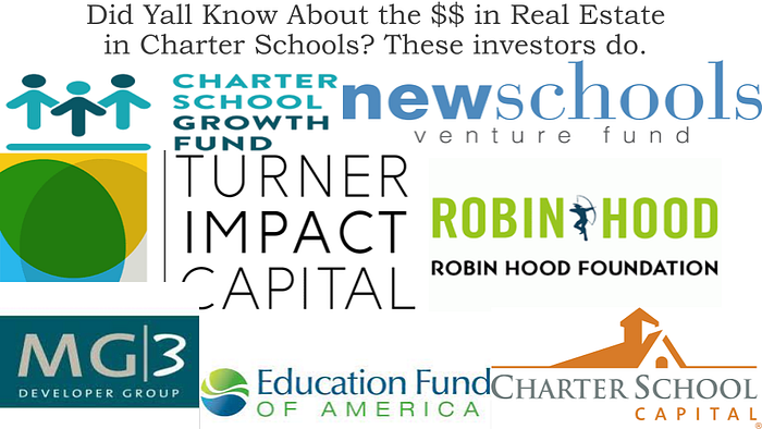 Groups like these (above) invest, meaning put up money, to make money by propping up corporate charter schools, and dismantling specifically public schools with majority students and teachers of color in the process. These investment firms, started by the rich (and white), are quite literally making money by exploiting low-income Black and Latino communities and profiting mightily from it.